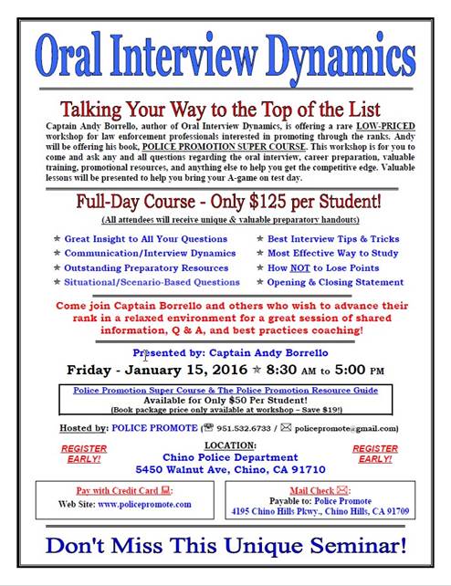 All - I have a seminar coming up in Chino on January 15th. If you know those looking to promote or can forward this info to your contacts, I'd appreciate it!! Students can register at http://www.policepromote.com/