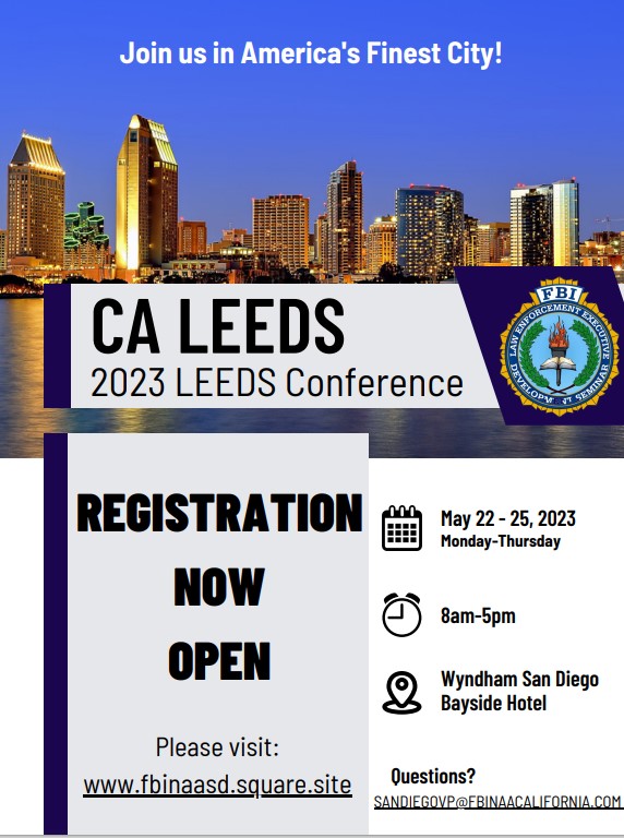Registration is open for the 2023 FBI California Law Enforcement Executive Development Seminar (LEEDS). Please view the attached flyer and mark your calendars for May 22-25, 2023 at the Wyndham San Diego Bayside.