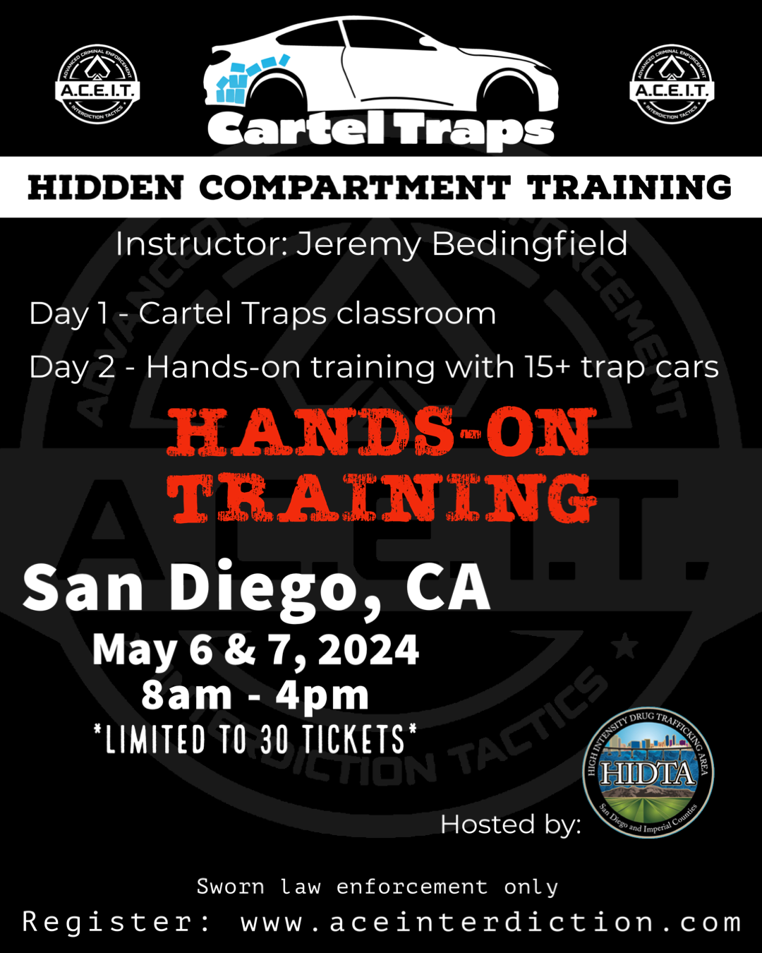 Course Description: This TWO-DAY training will include the original Cartel Traps class and an entire day of hands-on training with 15+ actual trap cars. The traps include floor traps, firewall traps, roof traps, battery traps and more. This is a rare opportunity you don't want to miss!