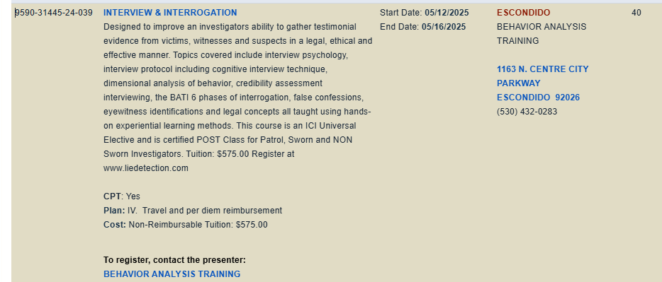 Good morning, if any one is looking to send officers to INTERVIEW INTERROGATION TRAINING. Here is what's available locally.